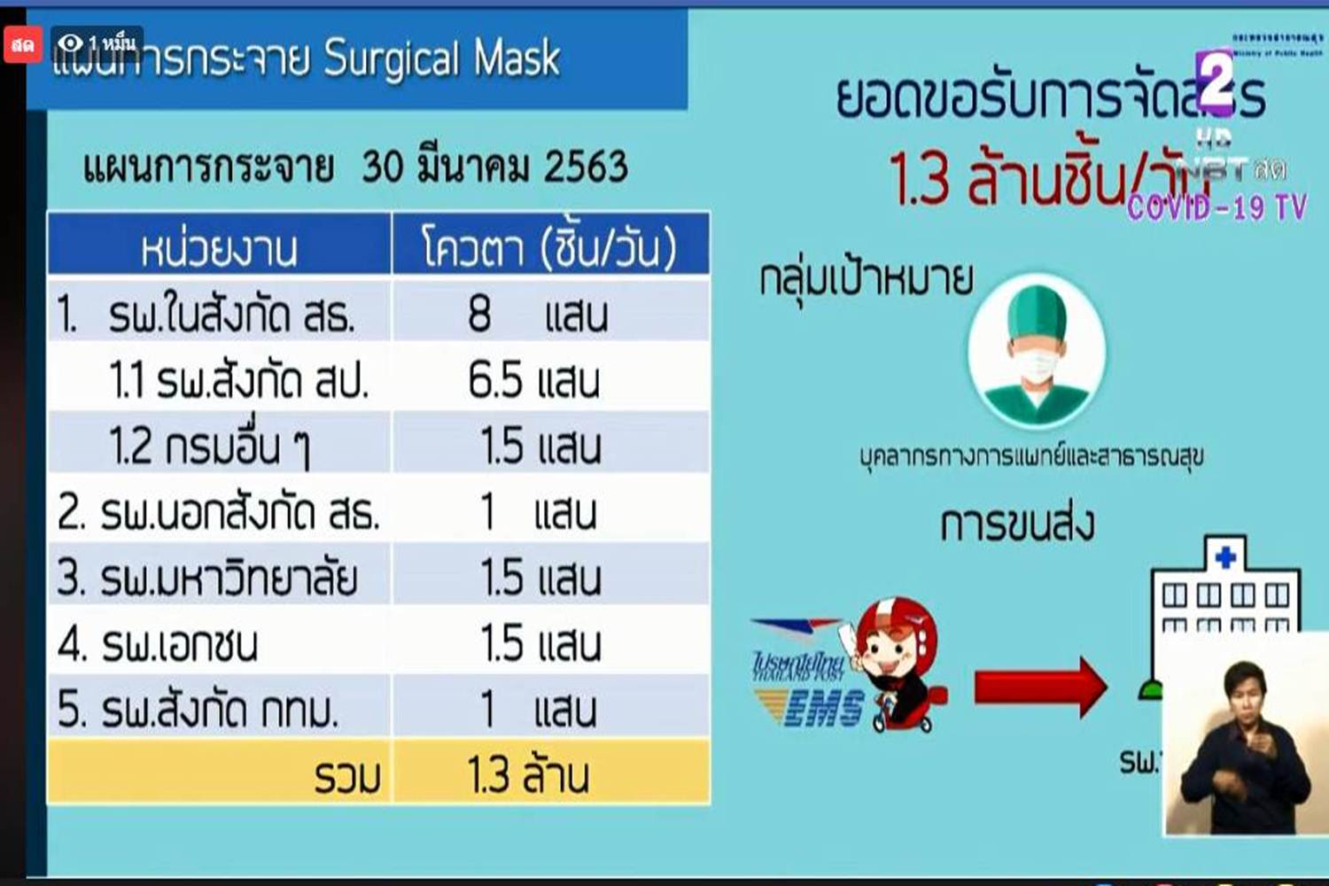 รองนายกฯแจงโควต้าจัดสรรหน้ากากอนามัยวันละ 2.3 ล้านชิ้น ให้ สธ. 1.3ล้านชิ้น มหาดไทย 1 ล้านชิ้น โดยให้ไปรษณีย์ทำหน้าที่จัดส่ง