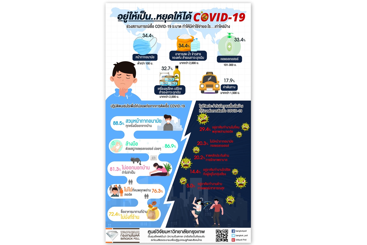 กรุงเทพโพลล์โดยศูนย์วิจัยมหาวิทยาลัยกรุงเทพ สำรวจความคิดเห็นประชาชน เรื่อง “อยู่ให้เป็น...หยุดให้ได้ : COVID-19” โดยเก็บข้อมูลกับประชาชนจากทุกภูมิภาคทั่วประเทศ ด้วยแบบสอบถามออนไลน์ จำนวนทั้งสิ้น 1,054 คน พบว่า