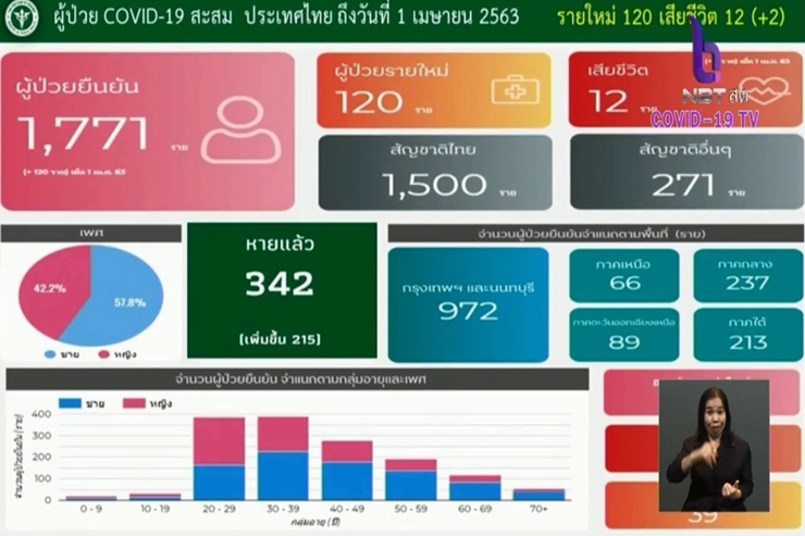 โฆษกศบค.แถลงยอดผู้ติดเชื้อโควิด-19ในไทยเพิ่ม 120 ราย ยอดสะสม 1,771 ราย เสียชีวิต 2 ราย รวม 12 ราย
