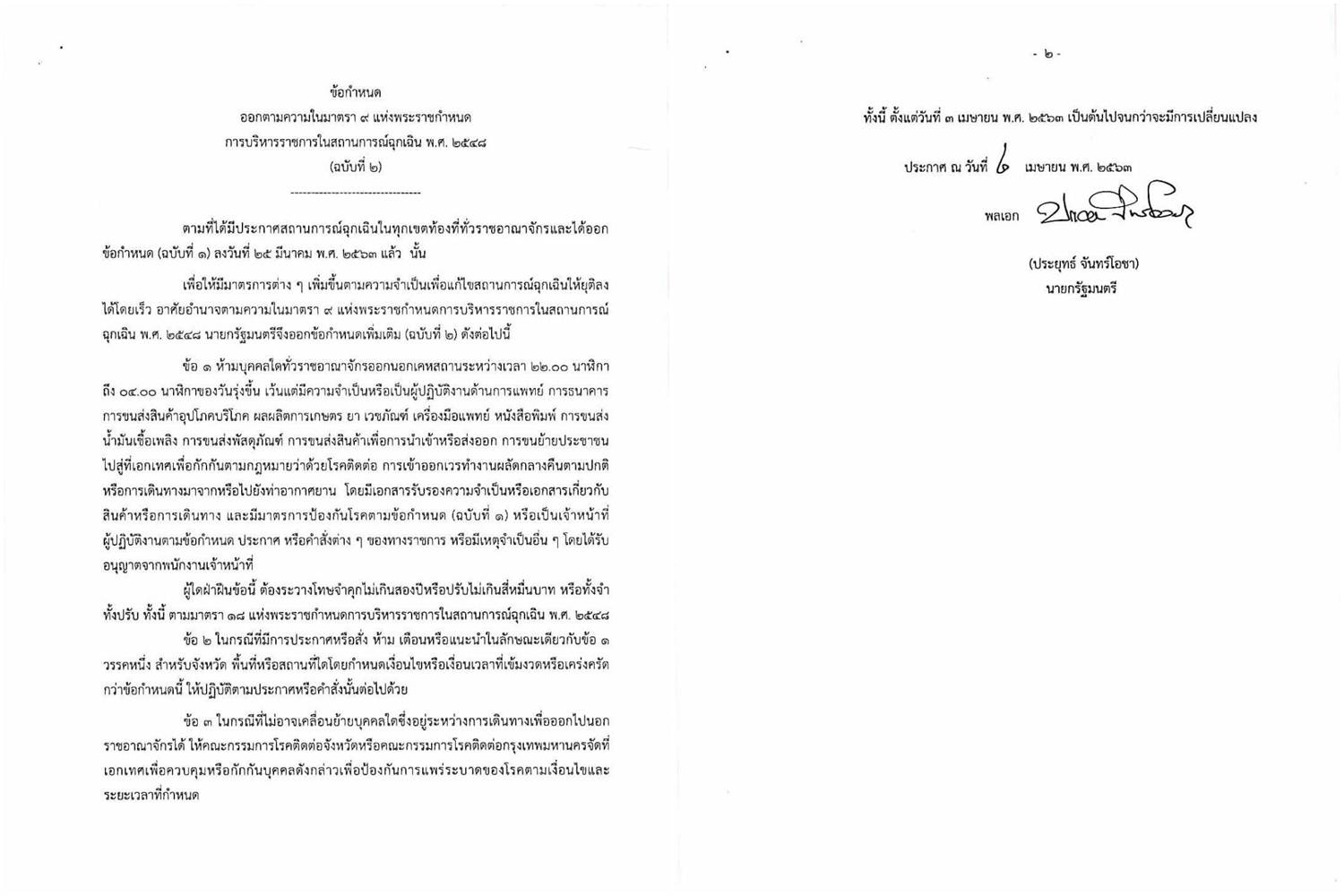 เมื่อวันที่ 2 เม.ย. 63 พล.อ.ประยุทธ์ จันทร์โอชา นายกรัฐมนตรี และรมว.กลาโหม ได้ออก "ข้อกำหนดฉบับที่2" ออกตามความในมาตรา 9 แห่งพ.ร.ก.การบริหารราชการในสถานการณ์ฉุกเฉิน พ.ศ. 2548 โดยมีผลบังคับใช้ตั้งแต่ "วันที่ 3 เม.ย. 63" มีสาระสำคัญดังนี้
