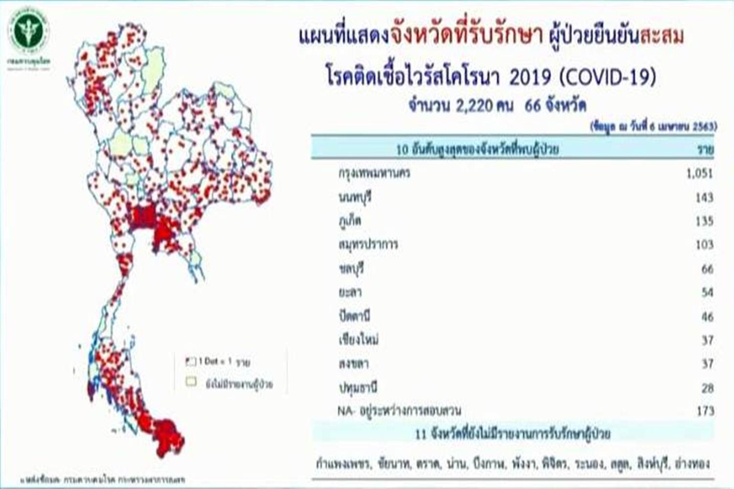 นพ.ทวีศิลป์ วิษณุโยธิน โฆษกศูนย์บริหารสถานการณ์แพร่ระบาดโควิด-19 (ศบค.) กล่าวระหว่างแถลงสถานการณ์ระบาดของเชื้อไวรัสโควิด-19ประจำวันว่า ปัจจุบันประเทศไทยมีผู้ติดเชื้อโควิด-19สะสม 2,220 กระจายอยู่ใน 66 จังหวัด โดย กรุงเทพฯมียอดผู้ป่วยสูงสุดที่ 1,051 ราย รองลงมาได้แก่ นนทบุรี 143 ราย และ ภูเก็ต 135 ราย