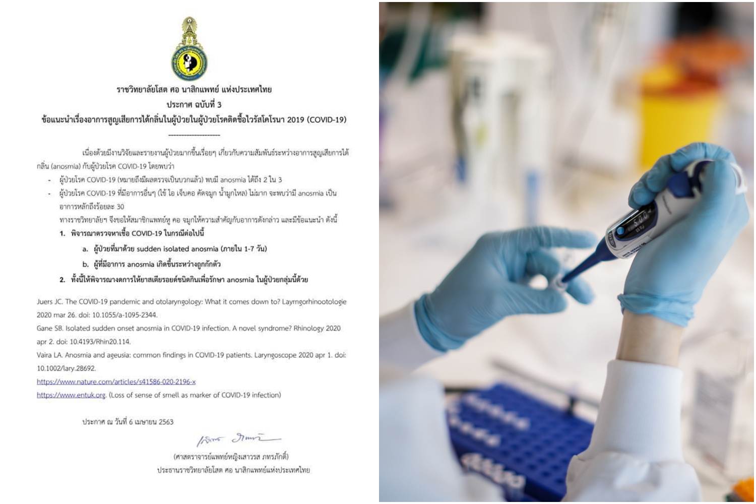 ราชวิทยาลัยโสต ศอ นาสิกแพทย์ แห่งประเทศไทย (หู คอ จมูก) ได้เผยแพร่ประกาศฉบับที่ 3 ข้อแนะนำ เรื่องอาการสูญเสียการได้กลิ่นในผู้ป่วยโรคติดเชื้อไวรัสโคโรนา 2019 (โควิด-19) โดยระบุว่า