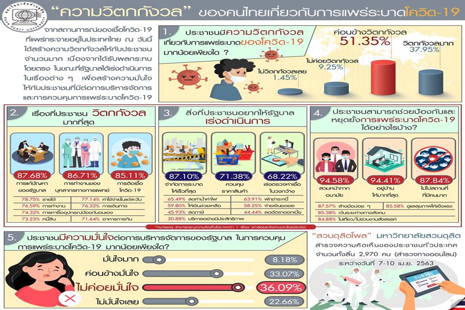 เมื่อวันที่ 12 เม.ย. 63 สวนดุสิตโพล มหาวิทยาลัยสวนดุสิต เปิดเผยผลสำรวจความคิดเห็นของประชาชนทั่วประเทศ เรื่อง ความวิตกกังวลขอคนไทยเกี่ยวกับการแพร่ระบาดโควิด-19 โดยสำรวจความคิดเห็นของประชาชนทั่วประเทศ จำนวนทั้งสิ้น 2,970 คน (สำรวจทางออนไลน์) ระหว่างวันที่ 7-10 เม.ย.63