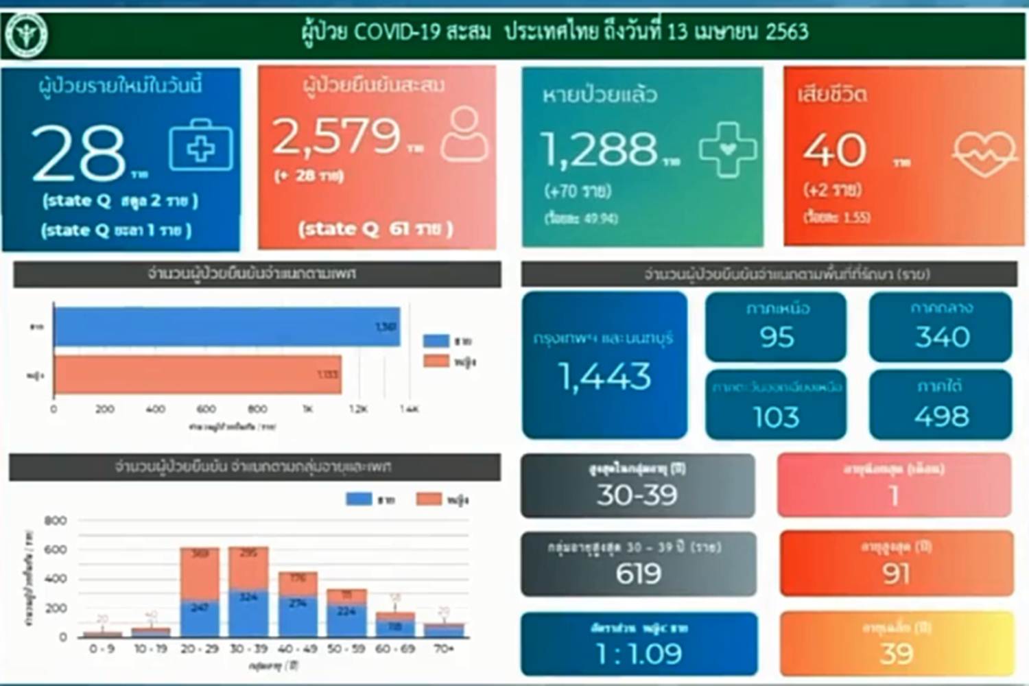 ศบค.แถลงยอดผู้ติดเชื้อไวรัสโควิด-19รายใหม่ในไทยเพิ่ม 28 ราย รวมสะสม 2,579 ราย เสียชีวิตเพิ่มอีก 2 ราย ขณะที่ผู้รักษาหายรวม 1,288 ราย