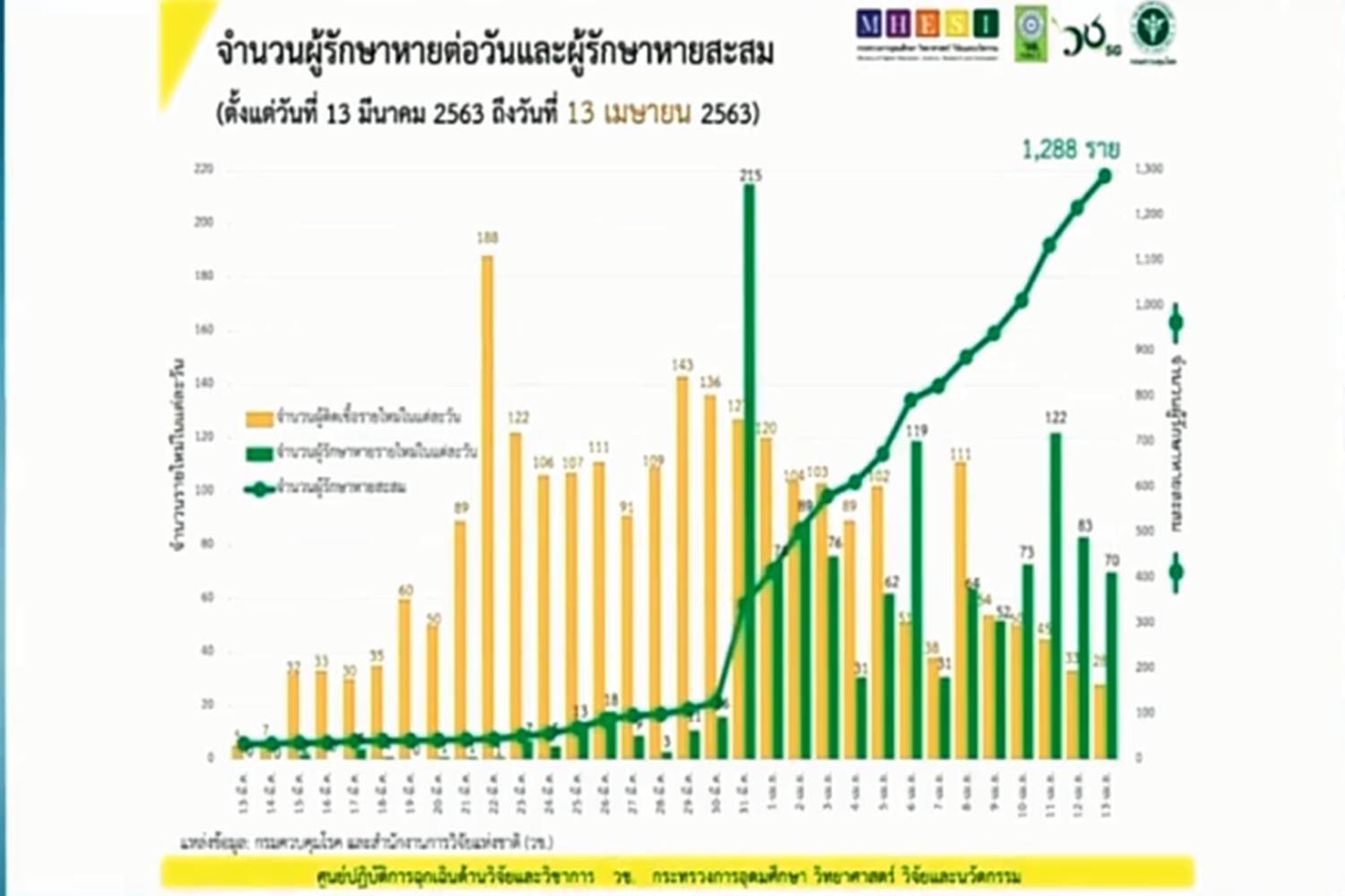 นพ.ทวีศิลป์ วิษณุโยธิน โฆษกศูนย์บริหารสถานการณ์การแพร่ระบาดของโรคติดเชื้อไวรัสโคโรนา 2019 (โควิด-19) หรือ ศบค. กล่าวระหว่างการแถลงสถานการณ์ระบาดเชื้อไวรัสโควิด-19ว่า ขณะนี้จำนวนผู้ติดเชื้อที่ได้รับการรักษาหายต่อวันได้เพิ่มแซงหน้าจำนวนผู้ติดเชื้อรายใหม่แล้ว โดยในวันนี้มียอดผู้รักษาหายแล้ว 70 ราย และมีผู้ติดเชื้อรายใหม่ 28 ราย ซึ่งสะท้อนถึงประสิทธิภาพของระบบสาธารณสุขของไทยที่สามารถดูแลผู้ป่วยได้เป็นอย่างดี