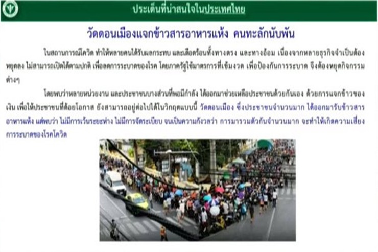 โฆษกศบค. กล่าวอีกว่า เห็นภาพข่าว มีการยืนต่อแถวรับบริจาคข้าวสารอาหารแห้ง ที่วัดแห่งหนึ่งก็ตกใจ จึงต้องขอหากท่านที่มีใจเป็นกุศลอยากบริจาค ท่านต้องมีระบบที่ดี ยืนห่างกัน ใส่หน้ากากอนามัยตลอดเวลา ซึ่งทาง ศบค. เข้าใจความเดือดร้อนของประชาชนดี และ วอนประชาชนที่ไปต่อแถว เฝ้าระวังตัวเอง 7-14 วัน หวั่นเกิด Super Spreader จนนำมาสู่การแพร่ระบาดวงกว้าง