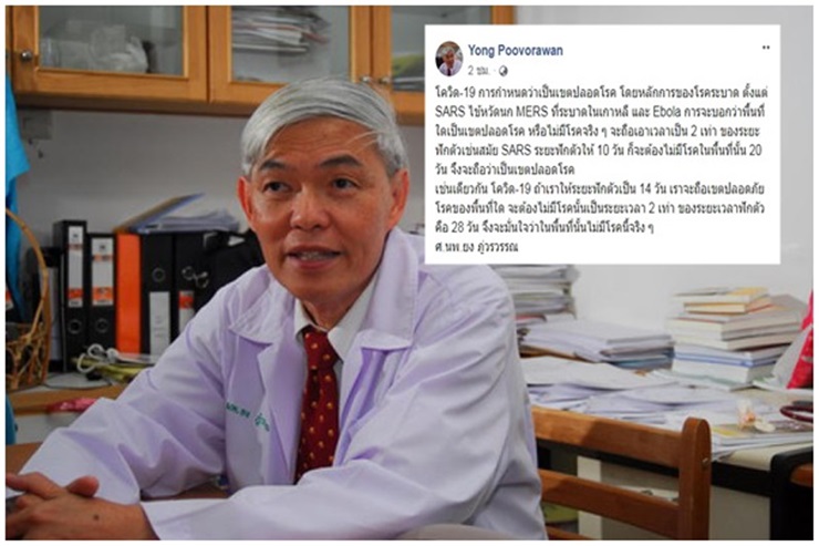 เมื่อวันที่ 23 เม.ย. ศ.นพ.ยง ภู่วรวรรณ หัวหน้าศูนย์เชี่ยวชาญเฉพาะทางด้านไวรัสวิทยาคลินิก คณะแพทยศาสตร์ จุฬาลงกรณ์มหาวิทยาลัย โพสต์เฟซบุ๊ก ระบุว่า โควิด-19 การกำหนดว่าเป็นเขตปลอดโรค โดยหลักการของโรคระบาด ตั้งแต่ SARS ไข้หวัดนก MERS ที่ระบาดในเกาหลี และ Ebola การจะบอกว่าพื้นที่ใดเป็นเขตปลอดโรค หรือไม่มีโรคจริง ๆ จะถือเอาเวลาเป็น 2 เท่า ของระยะฟักตัวเช่นสมัย SARS ระยะฟักตัวให้ 10 วัน ก็จะต้องไม่มีโรคในพื้นที่นั้น 20 วัน จึงจะถือว่าเป็นเขตปลอดโรค