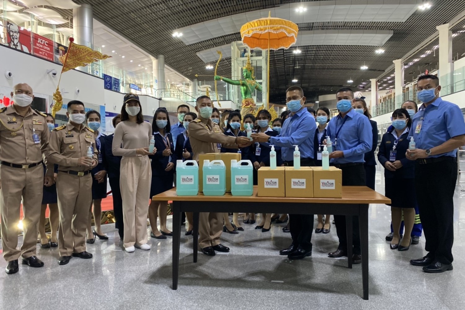 แพนเค้ก โฆษกพิเศษกองทัพเรือ นำนักศึกษา พสบ.ทร.รุ่น15 มอบเจลแอลกอฮอล์ 60ลิตรให้สนามบินอู่ตะเภา สู้ภัยโควิด-19