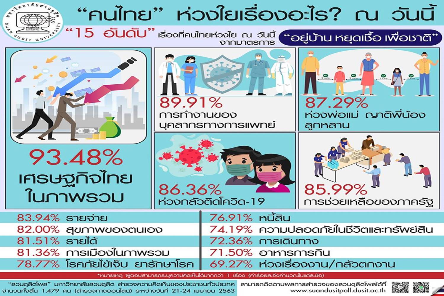 เมื่อวันที่ 26 เม.ย. 63 สวนดุสิตโพล มหาวิทยาลัยสวนดุสิต เปิดเผยผลสำรวจความคิดเห็นของประชาชนทั่วประเทศ เรื่องง "คนไทย" ห่วงใยเรื่องอะไร? ณ วันนี้ โดยสำรวจกลุ่มตัวอย่าง 1,479 คน (สำรวจทางออนไลน์) ระหว่างวันที่ 21-24 เม.ย. 63 ต่อกรณีที่ รัฐบาลประกาศมาตรการ "อยู่บ้าน หยุดเชื้อ เพื่อชาติ" เพื่อป้องกันการแพร่ระบาดของไวรัสโควิด–19 และเพิ่มมาตรการบรรเทาความเดือดร้อนหวังช่วยแบ่งเบาภาระของประชาชน สรุปผลได้ ดังนี้