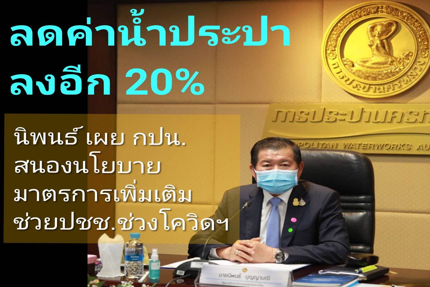 เมื่อวันที่ 28 เม.ย. 63 นายนิพนธ์ บุญญามณี รัฐมนตรีช่วยว่าการกระทรวงมหาดไทย เปิดเผยว่า สืบเนื่องจาก การประชุมมอบนโยบายให้แก่คณะกรรมการการประปานครหลวง(บอร์ดกปน.)?ชุดใหม่ไปเมื่อวันที่ 27 เม.ย.63 ซึ่งได้เน้นย้ำภารกิจเร่งด่วนความสำคัญของบอร์ดกปน.ในขณะนี้คือเรื่องการลดภาระค่าใช้จ่ายเพื่อบรรเทาความเดือดร้อนให้แก่ประชาชนช่วงสถานการณ์โควิด-19 โดยการออกมาตรการเพิ่มเติมจากที่การประปานครหลวง(กปน.)ได้ดำเนินการไปแล้ว