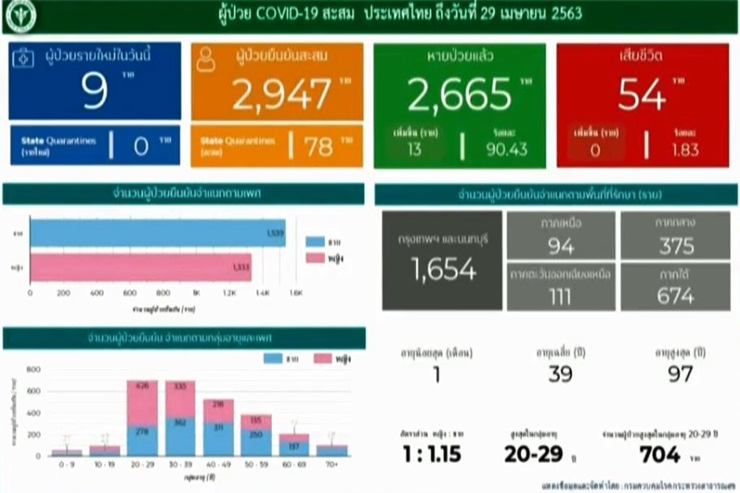 เมื่อวันที่ 29 เม.ย. 63 นพ.ทวีศิลป์ วิษณุโยธิน โฆษกกระทรวงสาธารณสุข ในฐานะโฆษกศูนย์บริหารสถานการณ์การแพร่ระบาดของโรคติดเชื้อไวรัสโคโรนา 2019 (ศบค.) โดยมีเนื้อหาสรุปดังนี้