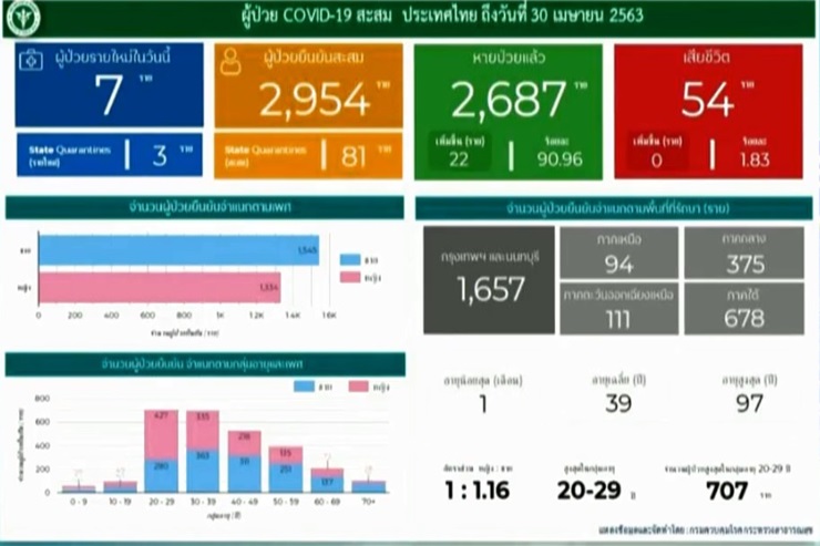 เมื่อวันที่ 30 เม.ย. 63 นพ.ทวีศิลป์ วิษณุโยธิน โฆษกกระทรวงสาธารณสุข ในฐานะโฆษกศูนย์บริหารสถานการณ์การแพร่ระบาดของโรคติดเชื้อไวรัสโคโรนา 2019 (ศบค.) โดยมีเนื้อหาสรุปดังนี้