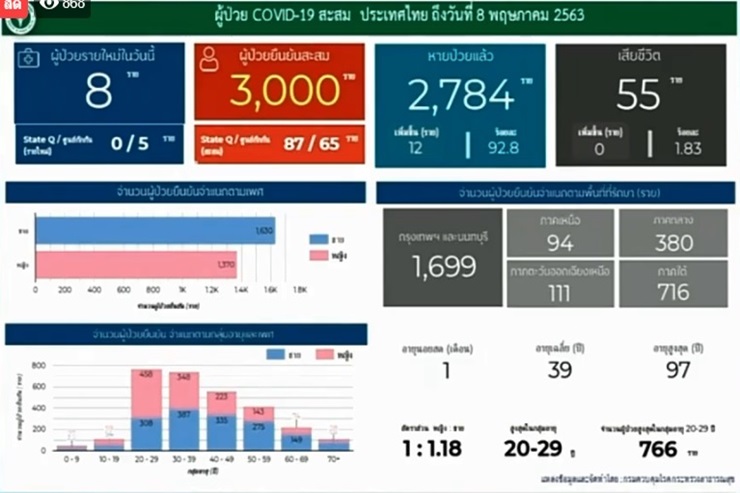 โฆษกศบค.แถลงไทยมียอดผู้ติดเชื้อโควิดรายใหม่ 8 ราย แตะ 3,000 ราย  ไม่มีผู้เสียชีวิต ขณะที่ผู้ป่วยรักษาหายแล้วรวม 2,784 ราย