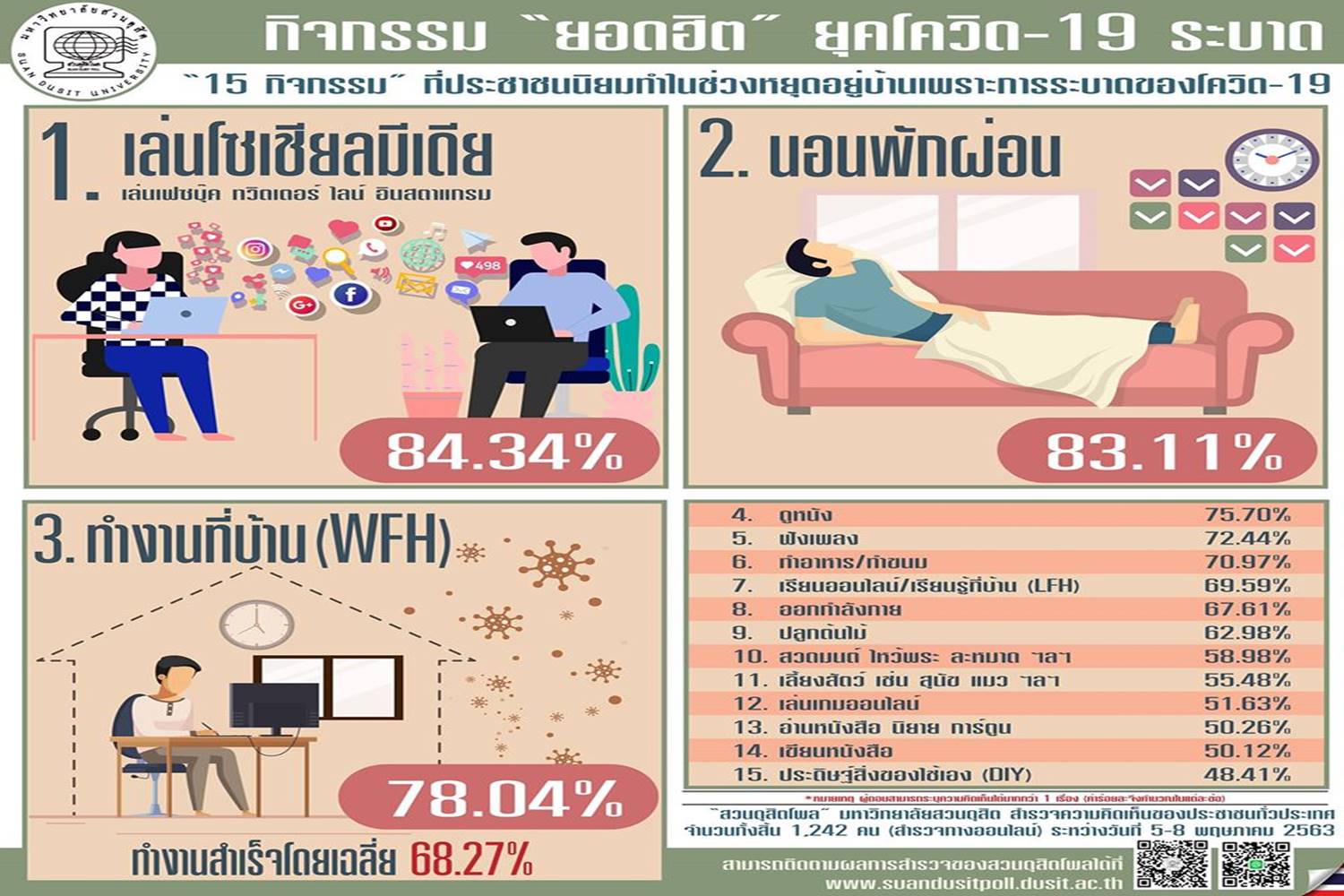 ดุสิตโพลเผย 15 กิจกรรมที่ประชาชนนิยมทำในช่วงหยุดอยู่บ้านจากการระบาดของเชื้อไวรัสโควิด-19 ขณะที่คนทำงานที่บ้าน 68.27% สามารถทำงานได้สำเร็จ