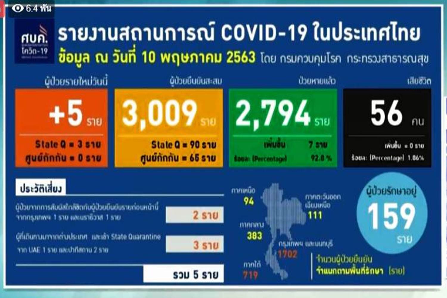 เมื่อวันที่ 10 พ.ค. 63 นพ.ทวีศิลป์ วิษณุโยธิน โฆษกศูนย์บริหารสถานการณ์การแพร่ระบาดของโรคติดเชื้อไวรัสโคโรนา 2019 หรือ (ศบค.) แถลงสถานการณ์ระบาดของเชื้อไวรัสโควิด-19ประจำวันโดยมีเนื้อหาสรุปดังนี้