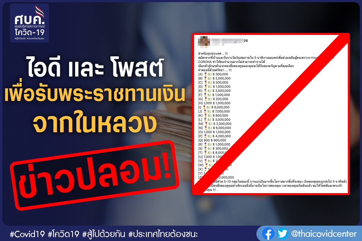 เพจเฟซบุ๊กฯ ศูนย์บริหารสถานการณ์โควิด-19 (ศบค.) โพสต์เตือนภัย ว่า "ขณะนี้ได้พบว่า มีผู้ใช้เฟซบุ๊กชื่อ "Maha Vajiralongkorn26" ได้โพสต์ข้อความแอบอ้าง โดยให้แชร์โพสต์ตามเงื่อนไขที่ระบุไว้ เพื่อรับพระราชทานเงินจากในหลวง ตรวจสอบแล้วพบว่าเป็นการนำเสนอข่าวปลอม ขอให้ประชาชนอย่าหลงเชื่อ หรือส่งต่อเพราะไม่ใช่ข้อความจริงแต่อย่างใด"