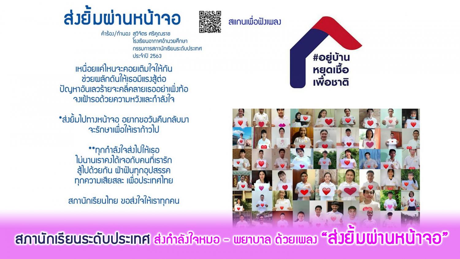 ทั้งนี้ พวกเราในนามสภานักเรียนระดับประเทศ สพฐ. จึงขอเป็นส่วนหนึ่งในการส่งมอบกำลังใจจากพวกเราซึ่งเป็นตัวแทนของเพื่อนสภานักเรียนโรงเรียนต่าง ๆ ทั่วประเทศ ด้วยการแต่งเพลง “ส่งยิ้มผ่านหน้าจอ” ความยาว 3 นาที ซึ่งเป็นบทเพลงที่สื่อถึงการส่งมอบกำลังใจของเด็ก เยาวชน และคนไทยทุกคน แด่บุคลากรทางการแพทย์และสาธารณสุข และทุกหน่วยงานที่เสียสละ เพื่อให้เราคนไทยก้าวผ่านพ้นโรคระบาดในครั้งนี้ไปด้วยกัน ซึ่งบทเพลง “ส่งยิ้มผ่านหน้าจอ” นี้แต่งและขับร้องโดย นายสุวิจิตร ศรีคูณราช ประธานสภานักเรียนโรงเรียนอากาศอำนวยศึกษา กรรมการสภานักเรียนระดับประเทศ สพฐ. ประจำปี 2563 โดยสามารถรับชมและรับฟังบทเพลงได้ที่เฟซบุ๊ก สภานักเรียนระดับประเทศ สพฐ. https://www.facebook.com/thailandstudentcouncil