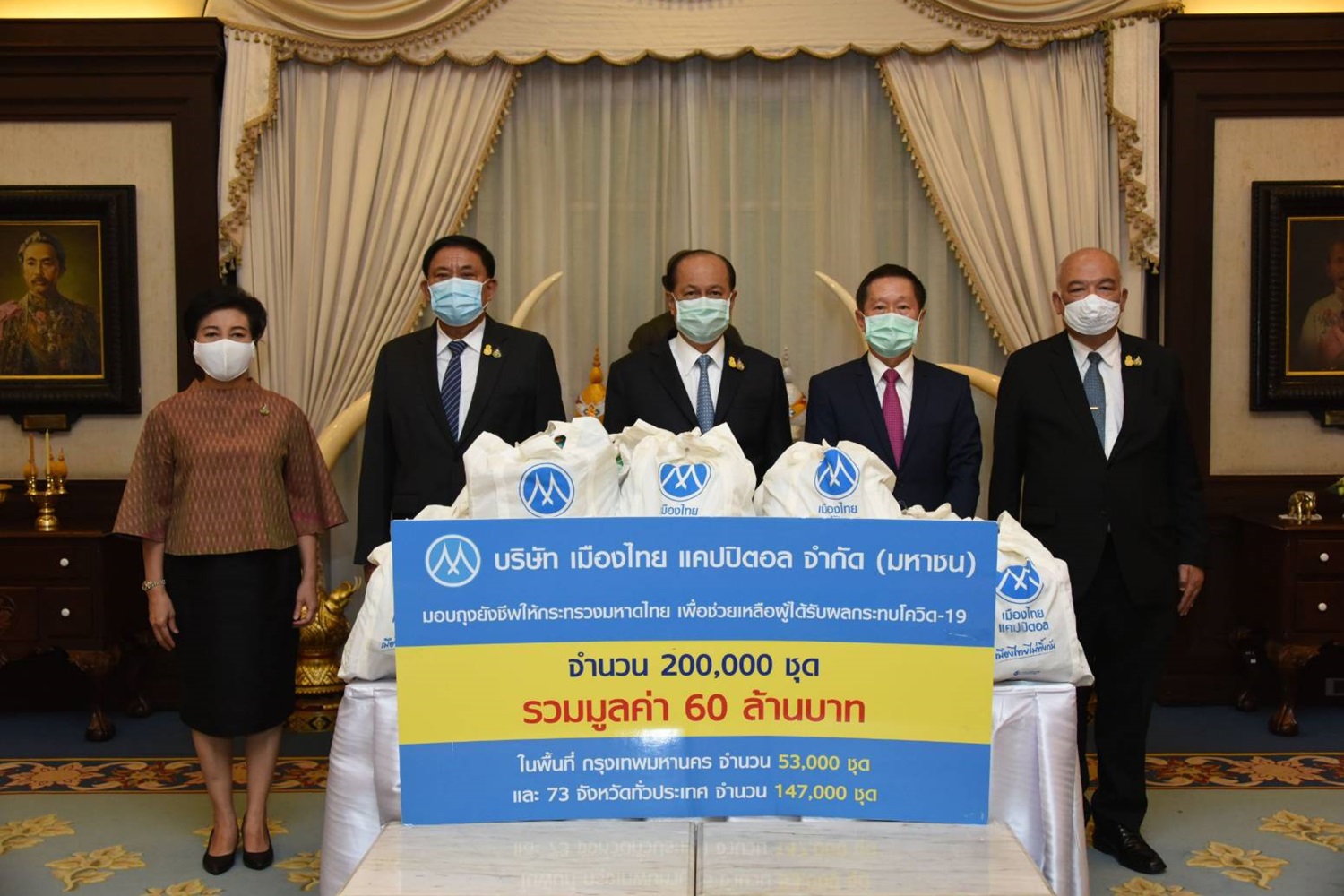 ดังนั้น บริษัท เมืองไทย แคปปิตอล จำกัด (มหาชน) จึงได้จัดสรรถุงยังชีพ จำนวน 200,000 ถุง เพื่อช่วยเหลือประชาชนทั่วประเทศ ซึ่งถุงยังชีพ ประกอบด้วย ข้าวสาร อาหารแห้ง มูลค่าถุงละ 300 บาท รวมเป็นเงิน 60 ล้านบาท โดยมอบผ่านรัฐมนตรีว่าการกระทรวงมหาดไทย จำนวน 147,000 ถุง เพื่อมอบให้ผู้ว่าราชการจังหวัดทั่วประเทศนำไปมอบให้กับประชาชนที่เดือดร้อน และมอบผ่านผู้ว่าราชการกรุงเทพมหานคร จำนวน 53,000 ถุง เพื่อนำไปมอบให้ประชาชนตามชุมชนต่างๆ ทั่วกรุงเทพมหานคร โดยมอบหมายให้บริษัท บิ๊กซี ซูเปอร์เซ็นเตอร์ จำกัด (มหาชน) เป็นผู้จัดสรรสิ่งของและส่งไปยังทุกจังหวัดเพื่อส่งมอบถุงยังชีพให้กับประชาชนต่อไป ซึ่งจะแล้วเสร็จภายในวันที่ 25 พฤษภาคม 2563 นี้