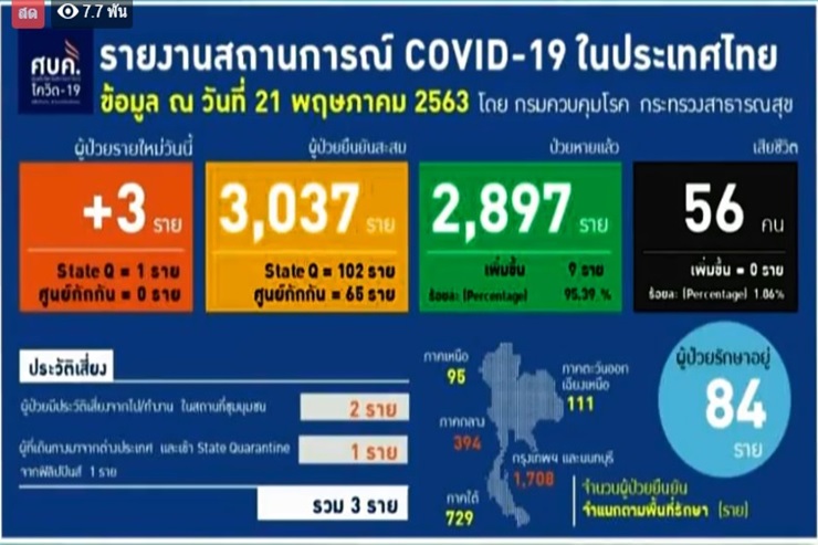 เมื่อวันที่ 21 พ.ค. 63 นพ.ทวีศิลป์ วิษณุโยธิน โฆษกศูนย์บริหารสถานการณ์โควิด-19 (ศบค.) แถลงแถลงสถานการณ์การแพร่ระบาดของไวรัสโควิด-19 ในประเทศประจำวัน โดยมีเนื้อหาสรุปดังนี้