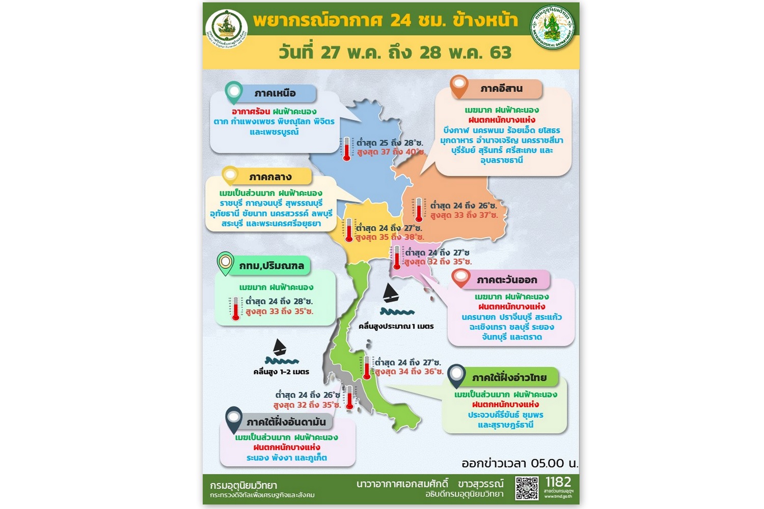 กรมอุตุนิยมวิทยา รายงาน ลักษณะอากาศทั่วไป ประจำวันที่ 27 พฤษภาคม 2563 พยากรณ์อากาศ 24 ชั่วโมงข้างหน้า ร่องมรสุมพาดผ่านประเทศเมียนมา ลาว และเวียดนาม เข้าสู่หย่อมความกดอากาศต่ำบริเวณอ่าวตังเกี๋ย ประกอบกับมรสุมตะวันตกเฉียงใต้ที่พัดปกคลุมทะเลอันดามันและประเทศไทยมีกำลังปานกลาง ลักษณะเช่นนี้ทำให้มีฝนตกหนักบางแห่งบริเวณภาคตะวันออกเฉียงเหนือ ภาคตะวันออก และภาคใต้ฝั่งตะวันตก ขอให้ประชาชนบริเวณดังกล่าวระวังอันตรายจากฝนที่ตกหนักและฝนที่ตกสะสมไว้ด้วยฝุ่นละอองขนาดเล็ก