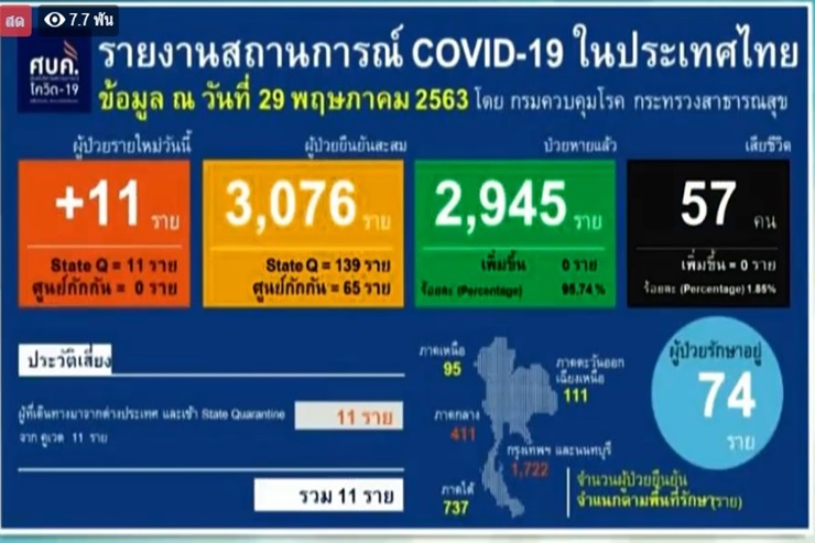 -ผู้ป่วยรายใหม่ทั้งหมดเป็นผู้เดินทางกลับมาจากต่างประเทศและเข้าสู่ State Quarantine เรียกว่ายังไม่มีการติดเชื้อรายใหม่ในประเทศ ซึ่งก็เป็นข่าวดีรองรับการจะผ่อนปรนระยะที่ 3