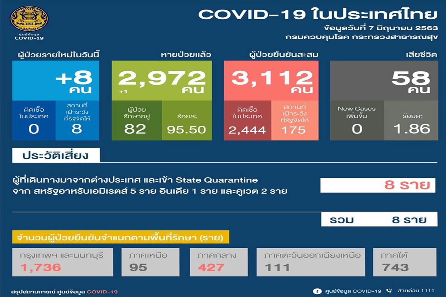 -พบผู้ป่วยติดเชื้อโควิดรายใหม่ 8 ราย / ยอดสะสม 3,112 ราย