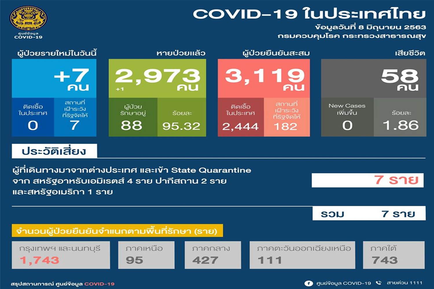 -พบผู้ป่วยโควิดรายใหม่ 7 ราย / ยอดสะสม 3,119 ราย