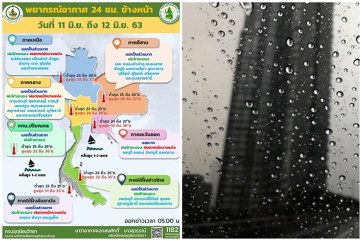 กรมอุตุนิยมวิทยา พยากรณ์อากาศประจำวันที่ 11 มิ.ย. 2563 ลักษณะอากาศทั่วไป พยากรณ์อากาศ 24 ชั่วโมงข้างหน้า มรสุมตะวันตกเฉียงใต้กำลังค่อนข้างแรงที่พัดปกคลุมทะเลอันดามันและประเทศไทยเริ่มมีกำลังอ่อนลง แต่ยังคงทำให้ด้านตะวันตกของประเทศไทย ภาคตะวันออก และภาคใต้ฝั่งตะวันตก ซึ่งเป็นด้านรับลมมรสุมยังคงมีฝนตกต่อเนื่อง และมีฝนตกหนักบางแห่ง ขอให้ประชาชนในพื้นที่เสี่ยงภัยในบริเวณดังกล่าว ระวังอันตรายจากฝนตกหนักและฝนที่ตกสะสมในพื้นที่เสี่ยงภัยไว้ด้วย