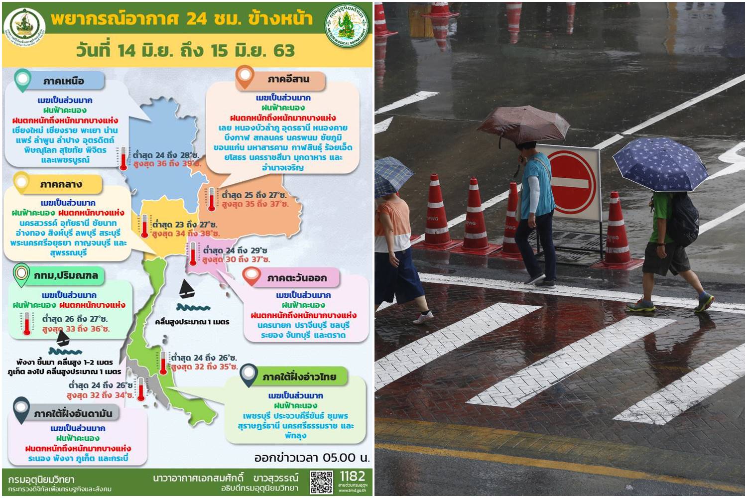 เมื่อวันที่ 14 มิ.ย. 63 กรมอุตุนิยมวิทยารายงาน ลักษณะอากาศทั่วไปว่า พยากรณ์อากาศ 24 ชั่วโมงข้างหน้า ประเทศไทยมีฝนเพิ่มขึ้น กับมีฝนตกหนักถึงหนักมากบางแห่งบริเวณภาคเหนือ ภาคตะวันออกเฉียงเหนือ ภาคกลาง ภาคตะวันออก และภาคใต้ฝั่งตะวันตก เนื่องจากมรสุมตะวันตกเฉียงใต้ที่พัดปกคลุมทะเลอันดามันและประเทศไทยมีกำลังแรงขึ้น ประกอบกับมีหย่อมความกดอากาศต่ำปกคลุมประเทศลาวตอนบน ขอให้ประชาชนบริเวณพื้นที่เสี่ยงภัยในภาคเหนือ ภาคตะวันออกเฉียงเหนือ ภาคตะวันออก และภาคใต้ ระวังอันตรายจากฝนที่ตกหนัก ซึ่งอาจทำให้เกิดน้ำท่วมฉับพลันและน้ำป่าไหลหลากได้