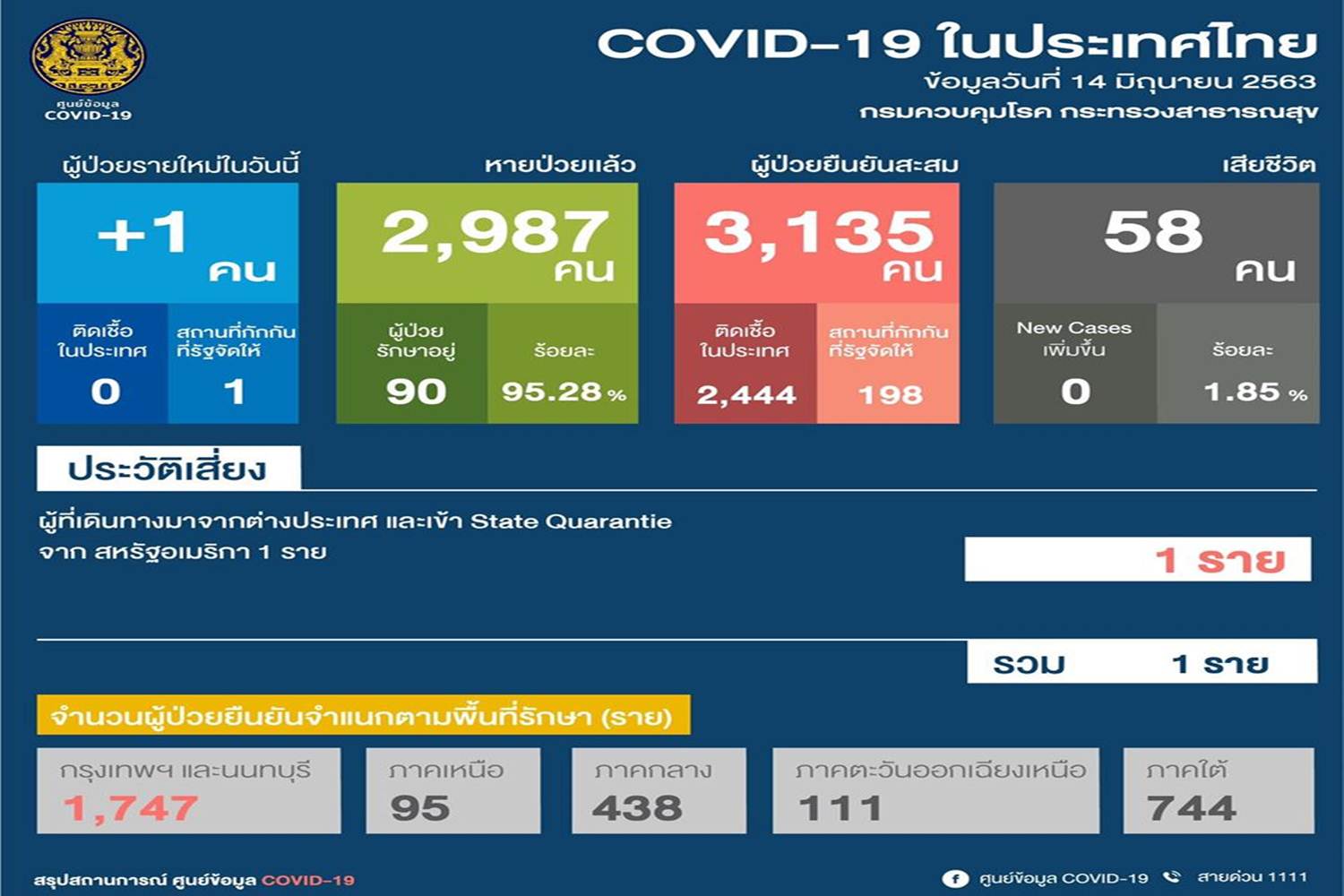 เมื่อวันที่ 14 มิ.ย. 63 ศูนย์บริหารสถานการณ์การแพร่ระบาดของโรคติดเชื้อไวรัสโคโรน่า 2019 (โควิด-19) หรือ ศบค. รายงานสถานการณ์โรคติดเชื้อโควิด-19ประจำวัน โดยมีเนื้อหาสรุปดังนี้