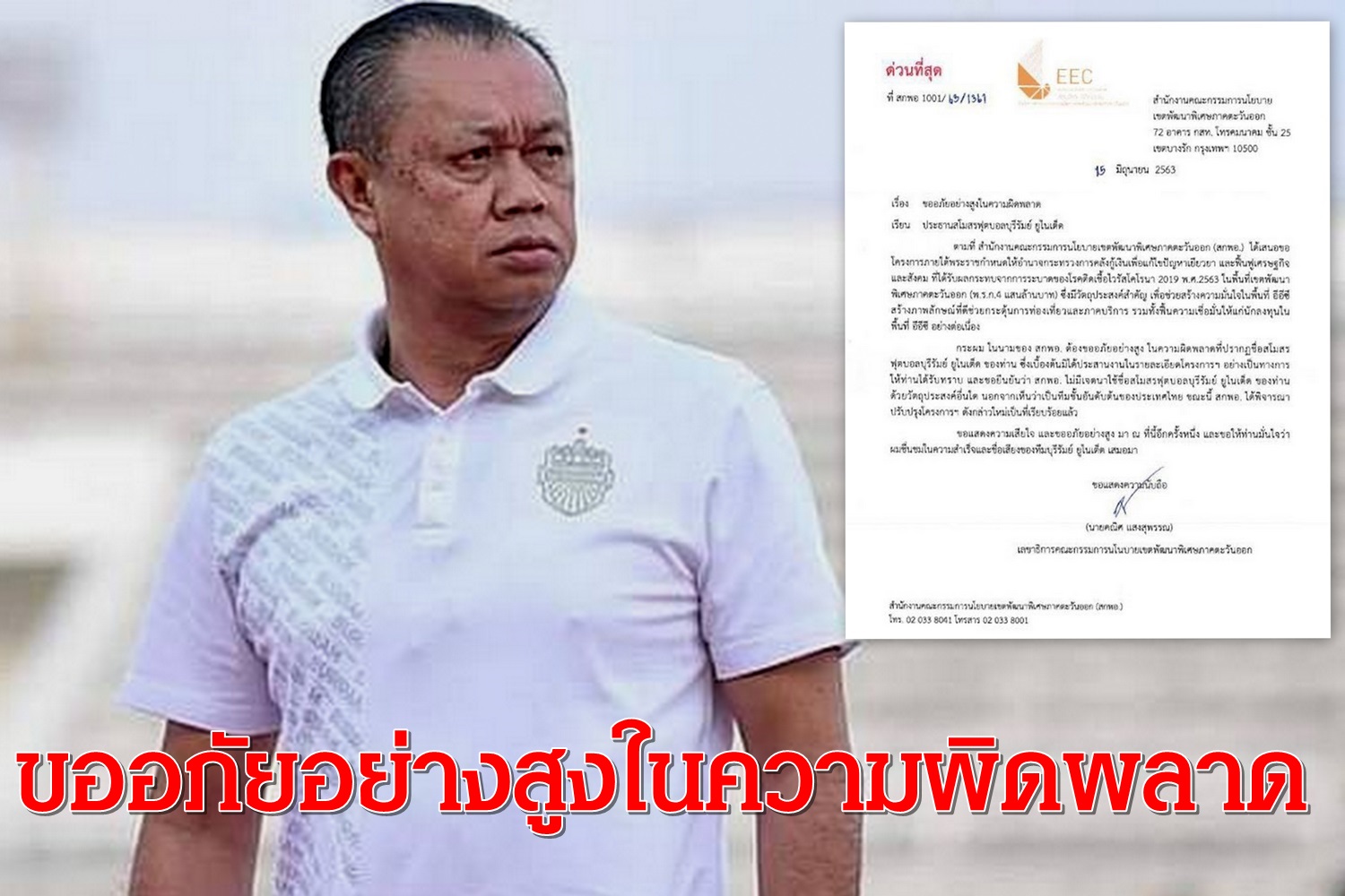 กระผมในนามของ สกพอ.ต้องขออภัยอย่างสูงในความผิดพลาดที่ปรากฏชื่อสโมสร ฟุตบอลบุรีรัมย์ยูไนเต็ดของท่าน ซึ่งเบื้องต้นมิได้ประสานงานในรายละเอียดโครงการอย่างเป็นทางการให้ท่านได้รับทราบ และขอยืนยันว่า สกพอ.ไม่มีเจตนาใช้ชื่อสโมสรฟุตบอลบุรีรัมย์ยูไนเต็ด ของท่านด้วยวัตถุประสงค์อื่นใด นอกจากเห็นว่าเป็นทีมชั้นอันดับต้นของประเทศไทย ขณะนี้ สกพอ.ได้พิจารณาปรับปรุงโครงการดังกล่าวใหม่เป็นที่เรียบร้อยแล้ว จึงขอแสดงความเสียใจและขออภัยอย่างสูง มาณที่นี้อีกครั้งหนึ่ง และขอให้ท่านมั่นใจว่า ผมชื่นชมในความสำเร็จและชื่อเสียงของทีมบุรีรัมย์ยูไนเต็ดเสมอมา