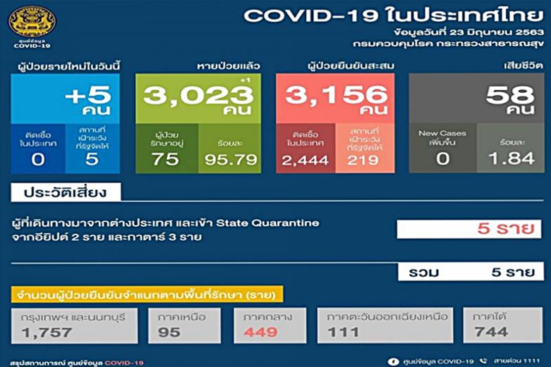แพทย์หญิงพรรณประภา ยงค์ตระกูล ผู้ช่วยโฆษกศูนย์บริหารสถานการณ์การแพร่ระบาดของโรคติดเชื้อไวรัสโคโรนา 2019 (โควิด-19) หรือ ศบค.แถลงสถานการณ์ผู้ป่วยโคโรนาไวรัส (โควิด-19) ประจำวันที่ 23 มิ.ย. 63 ว่า วันนี้มีผู้ป่วยโรคโควิด-19 รายใหม่ 5 ราย ไม่มีเสียชีวิตเพิ่มขึ้น ทำให้มียอดผู้ป่วยสะสมรวม 3,152 ราย ติดเชื้อในประเทศ 0 ราย หายกลับบ้านรวม 3,023 ราย รักษาตัวใน รพ. 75 ราย