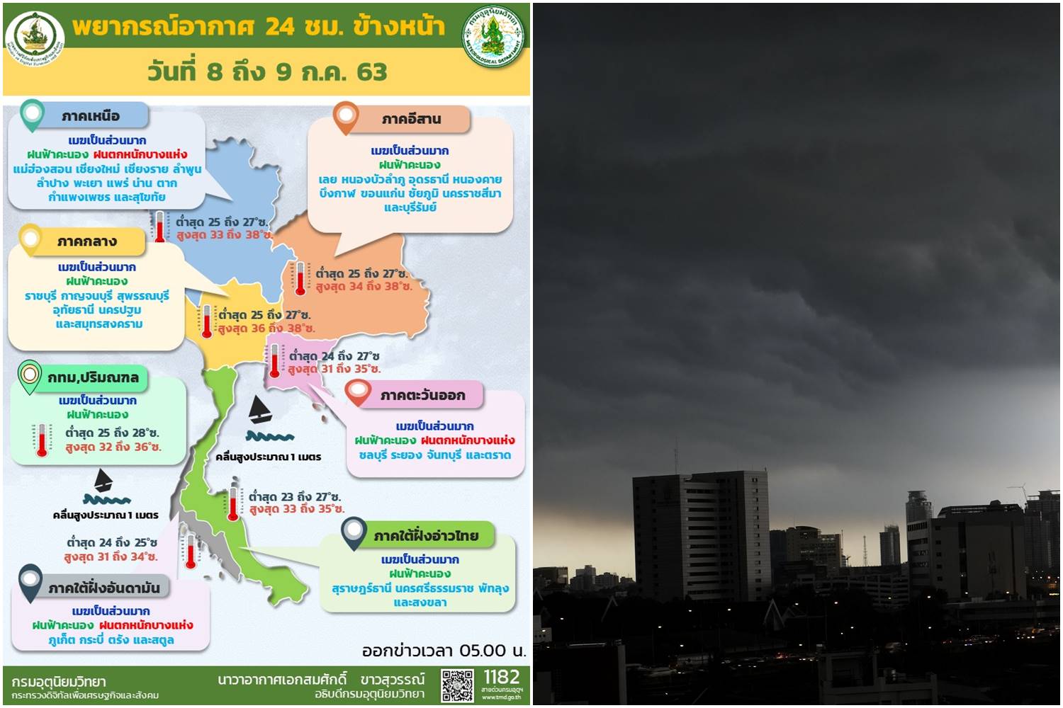 กรุงเทพมหานครและปริมณฑล เมฆเป็นส่วนมาก กับมีฝนฟ้าคะนอง ร้อยละ 40 ของพื้นที่ อุณหภูมิต่ำสุด 25-28 องศาเซลเซียส อุณหภูมิสูงสุด 32-36 องศาเซลเซียส ลมตะวันตกเฉียงใต้ ความเร็ว 10-25 กม./ชม.