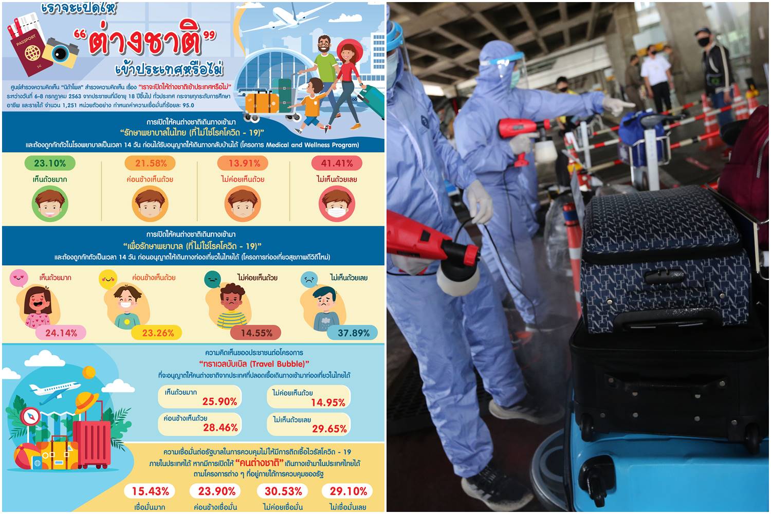 ศูนย์สำรวจความคิดเห็น “นิด้าโพล” สถาบันบัณฑิตพัฒนบริหารศาสตร์ (นิด้า) เปิดเผยผลสำรวจของประชาชน เรื่อง “เราจะเปิด ให้ต่างชาติเข้าประเทศหรือไม่” ทำการสำรวจระหว่างวันที่ 6 – 8 กรกฎาคม 2563 จากประชาชนที่มีอายุ 18 ปีขึ้นไป กระจายทุกภูมิภาค ระดับการศึกษาและอาชีพทั่วประเทศ รวมทั้งสิ้น จำนวน 1,251 หน่วยตัวอย่าง เกี่ยวกับการเปิดให้คนต่างชาติเดินทางเข้ามาในประเทศไทย