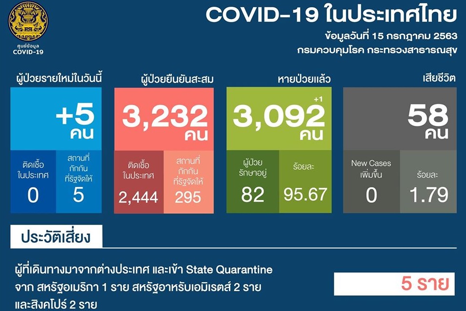 เมื่อวันที่ 15 ก.ค. 63 พญ.พรรณประภา ยงค์ตระกูล ผู้ช่วยโฆษกศูนย์บริหารสถานการณ์โควิด-19 (ศบค.) เปิดเผยสถานการณ์การแพร่ระบาดของไวรัสโควิด-19 ในประเทศวันนี้ว่า ว่า พบผู้ป่วยยืนยันติดเชื้อรายใหม่ 5 ราย โดยจำนวนผู้ป่วยยืนยันสะสมล่าสุดอยู่ที่ 3,232 ราย โดยเป็นผู้ติดเชื้อในประเทศ 2,444 ราย และจากสถานที่กักกันที่รัฐจัดให้ (State Quarantine) 295 ราย