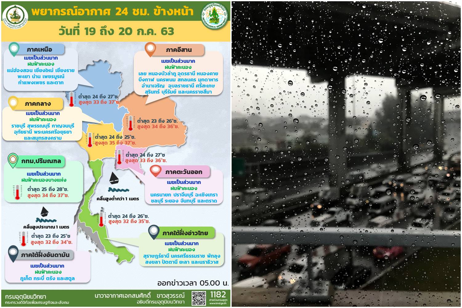 เมื่อวันที่ 19 ก.ค. 63 กรมอุตุนิยมวิทยารายงาน ลักษณะอากาศทั่วไปว่า พยากรณ์อากาศ 24 ชั่วโมงข้างหน้า มรสุมตะวันตกเฉียงใต้กำลังอ่อนพัดปกคลุมทะเลอันดามันและประเทศไทย ลักษณะเช่นนี้ทำให้ประเทศไทยมีการกระจายของฝนน้อย