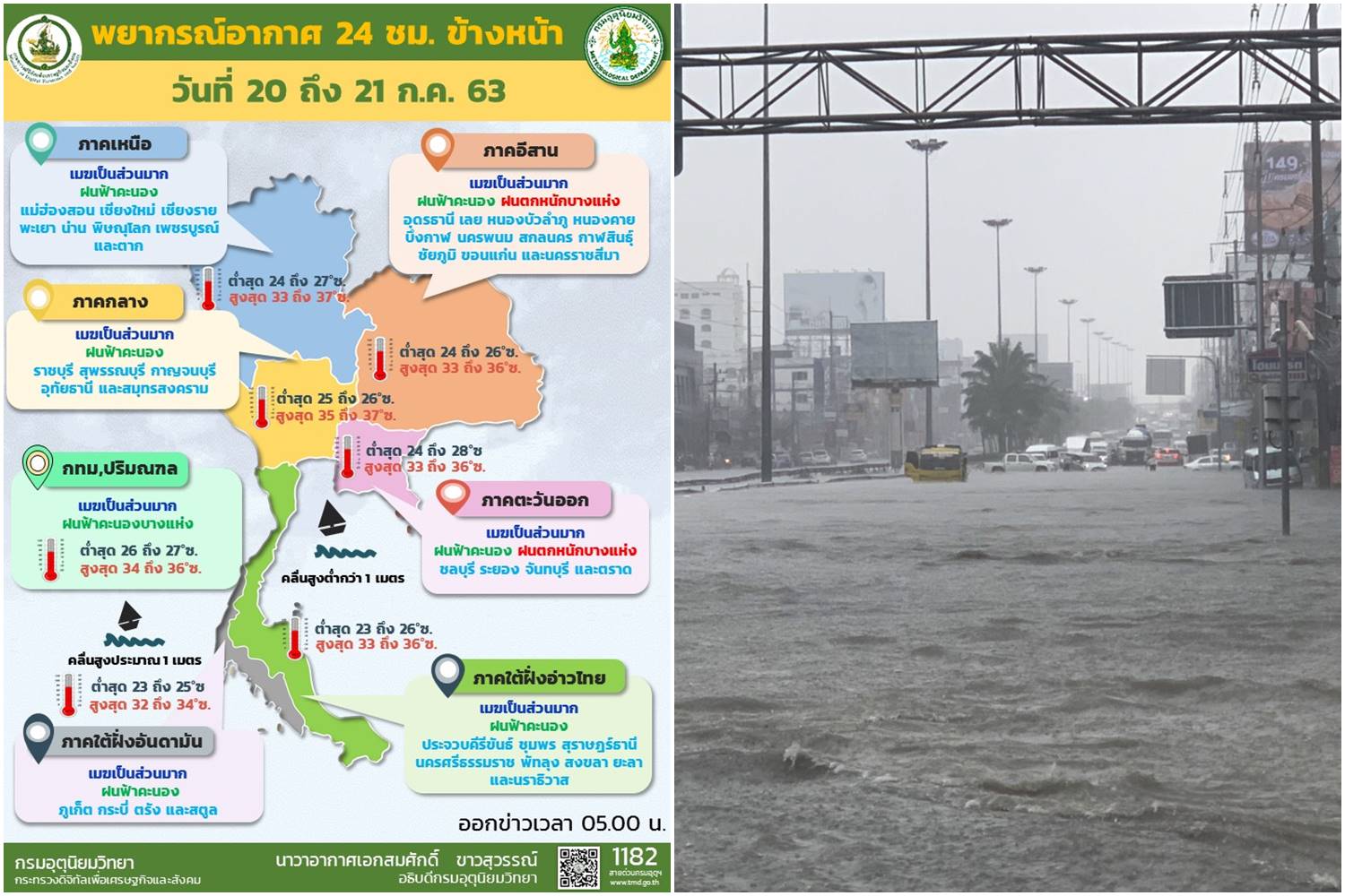 เมื่อวันที่ 20 ก.ค. 63 กรมอุตุนิยมวิทยารายงาน ลักษณะอากาศทั่วไปว่า พยากรณ์อากาศ 24 ชั่วโมงข้างหน้า มรสุมตะวันตกเฉียงใต้ยังคงพัดปกคลุมทะเลอันดามันและประเทศไทย ประกอบกับมีลมตะวันออกเฉียงใต้พัดปกคลุมภาคตะวันออกเฉียงเหนือและภาคตะวันออก ทำให้บริเวณประเทศไทยตอนบนมีฝนเพิ่มขึ้น โดยมีฝนตกหนักบางแห่งในภาคตะวันออกเฉียงเหนือและภาคตะวันออก