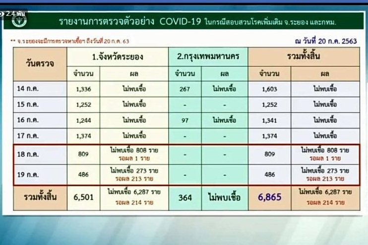 -ล่าสุดข้อมูล ณ วันที่ 20 ก.ค. 63 จังหวัดระยอง ตรวจไปแล้ว 6,501 ราย ไม่พบเชื้อ 6,287 ราย /รอผล214ราย