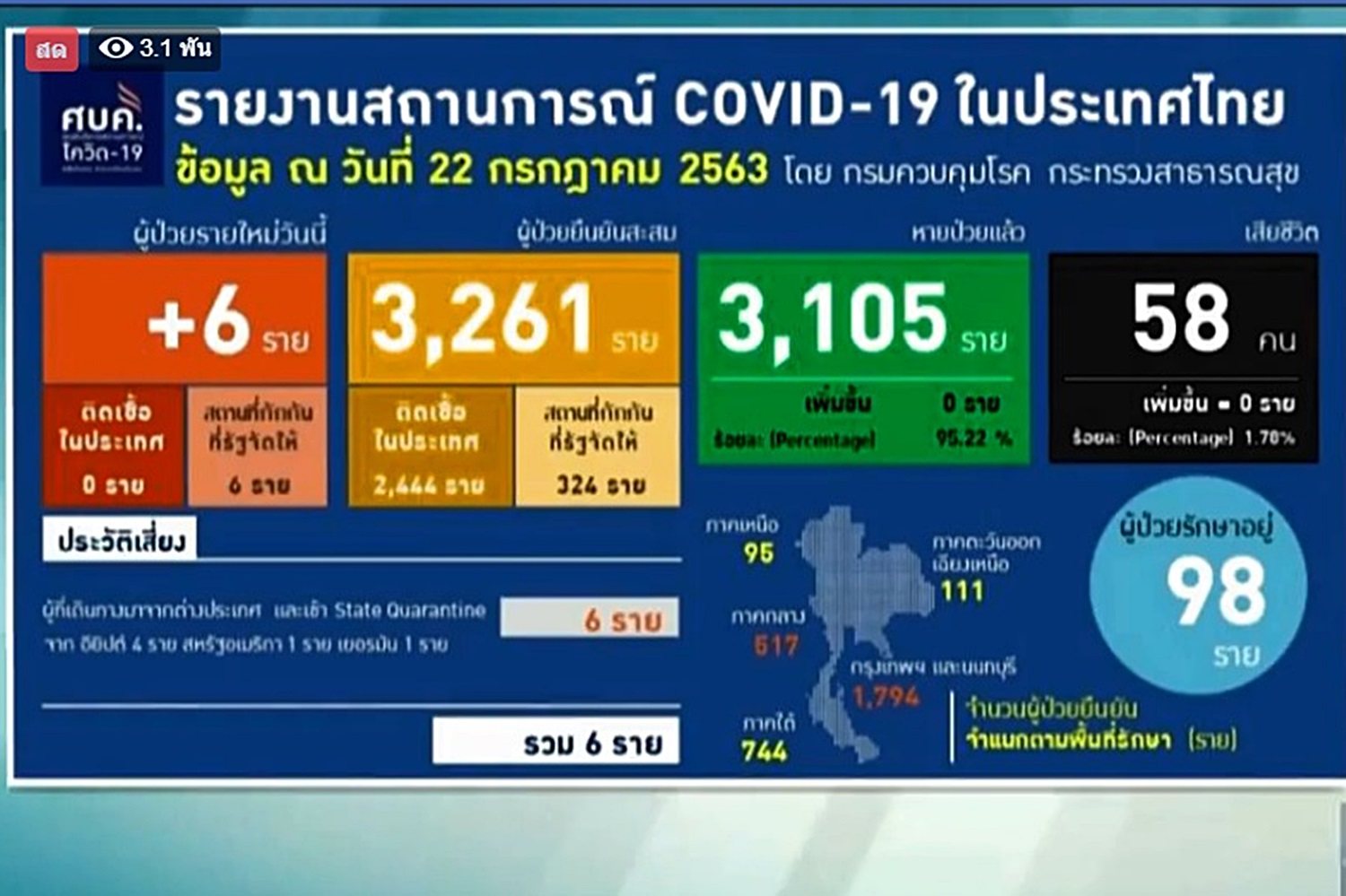 เมื่อวันที่ 22ก.ค.63 เวลา 12.00น.ที่ทำเนียบรัฐบาล นพ.ทวีศิลป์ วิษณุโยธิน โฆษกศูนย์บริหารสถานการณ์การแพร่ระบาดของโรคติดเชื้อไวรัสโคโรน่า 2019 (โควิด-19) หรือ ศบค.แถลงว่า สถานการณ์โควิด-19 ในประเทศไทย มีผู้ติดเชื้อรายใหม่เพิ่มขึ้น 6 ราย ที่เดินทางมาจากต่างประเทศ เข้าพักสถานที่เฝ้าระวังที่รัฐจัดให้ (State Quarantine) เดินทางมาจาก อียิปต์ 4 ราย อเมริกา 1 ราย เยอรมัน 1 ราย
