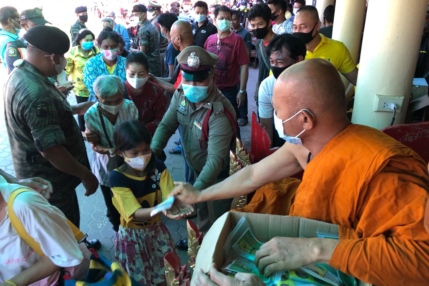 อย่างไรก็ตาม ปรากฎว่าตั้งแต่เช้ามีประชาชนมารอเข้าแถวเพื่อรับแจกกันอย่างเนื่องแน่น ทำให้เห็นภาพประชาชนวิ่งกรูกันไปมา ทางวัดต้องคอยประชาสัมพันธ์เรื่องการใส่หน้ากากอนามัยและให้เว้นระยะห่าง ตามมาตรการป้องกันโควิด-19 แต่ไม่เป็นผล แต่ประชาชนต่างพยายามเข้าใกล้ พระพิศาลสิทธิคุณ ให้ได้มากที่สุด เพราะกลัวว่าวัตถุมงคลจะหมดก่อนถึงมือ โดยมี พ.ต.อ.ดำรงศักดิ์ ทองงามตระกูล รอง ผบก.ภ.จ.ประจวบคีรีขันธ์ , พ.ต.อ.ไชยกร ศรีหล้าเดโช ผกก. สภ.บ้านยางชุม นำกำลังเจ้าหน้าที่ตำรวจ , ตชด., กู้ภัยมูลนิธิเพชรเกษมหัวหิน ดูแลประชาชนและอำนวยความสะดวกในการแจกวัตถุมงคล ตลอดจนจัดการจราจรที่หน้าวัดห้วยมงคล