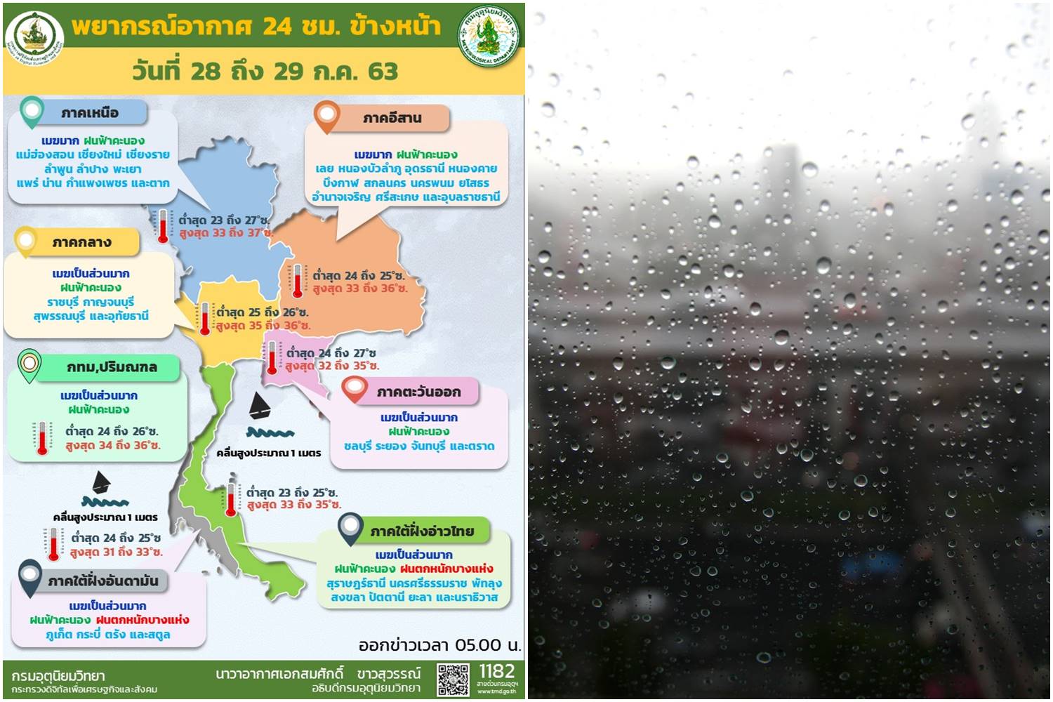 เมื่อวันที่ 28 ก.ค. 63 กรมอุตุนิยมวิทยารายงาน ลักษณะอากาศทั่วไปว่า พยากรณ์อากาศ 24 ชั่วโมงข้างหน้า มรสุมตะวันตกเฉียงใต้กำลังอ่อนที่พัดปกคลุมทะเลอันดามันและประเทศไทยเริ่มมีกำลังแรงขึ้น ประกอบกับมีหย่อมความกดอากาศต่ำปกคลุมประเทศลาวและเวียดนามตอนบน ลักษณะเช่นนี้ทำให้ภาคเหนือและภาคตะวันออกเฉียงเหนือเริ่มมีการกระจายของฝนเพิ่มขึ้น