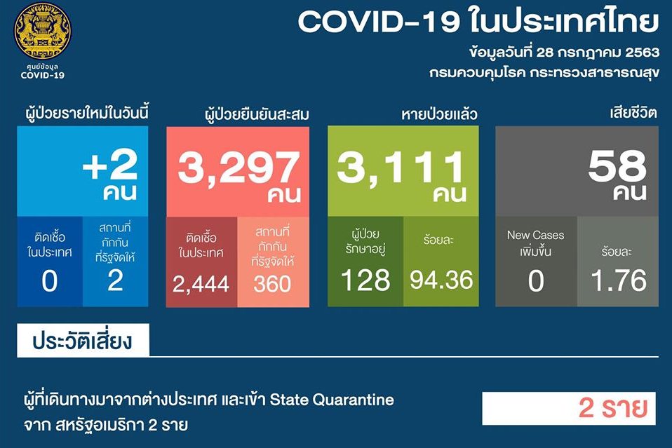 -พบผู้ป่วยรายใหม่ 2 ราย เป็นผู้เดินทางกลับจากต่างประเทศและเข้า State Quarantine