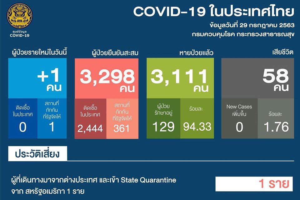 -ผู้ป่วยใหม่ 1 ราย เป็นทหารที่เดินทางกลับมาจากการฝึกอบรมที่ฐานทัพฮาวาย เมืองโฮโนลูลู ของสหรัฐอเมริกา เดินทางถึงไทยวันที่ 22 ก.ค.จากนั้นเข้าพัก State Quarantine จ.ชลบุรี เริ่มป่วยวันที่ 25 ก.ค.ด้วยอาการไข้ ไอ เจ็บคอ มีน้ำมูก มีเสมหะ ปวดกล้ามเนื้อ ปวดศีรษะ ส่งตรวจหาเชื้อวันที่ 27 ก.ค. (วันที่ 5) ผลพบเชื้อ