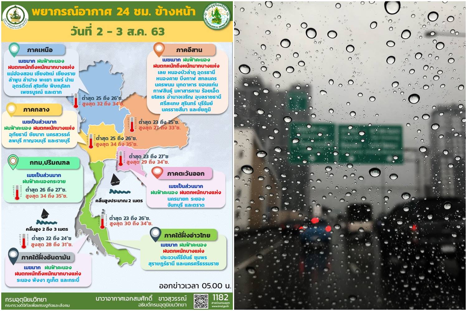 เมื่อวันที่ 2 ส.ค. 63 กรมอุตุนิยมวิทยารายงาน ลักษณะอากาศทั่วไปว่า พยากรณ์อากาศ 24 ชั่วโมงข้างหน้า ประเทศไทยมีฝนเพิ่มขึ้นกับมีฝนตกหนักถึงหนักมากบางแห่งบริเวณภาคเหนือ ภาคตะวันออกเฉียงเหนือ ภาคกลาง ภาคตะวันออก และภาคใต้ ขอให้ประชาชนบริเวณดังกล่าวระวังอันตรายจากฝนตกหนักถึงหนักมาก ซึ่งอาจทำให้เกิดน้ำท่วมฉับพลัน และน้ำป่าไหลหลากได้