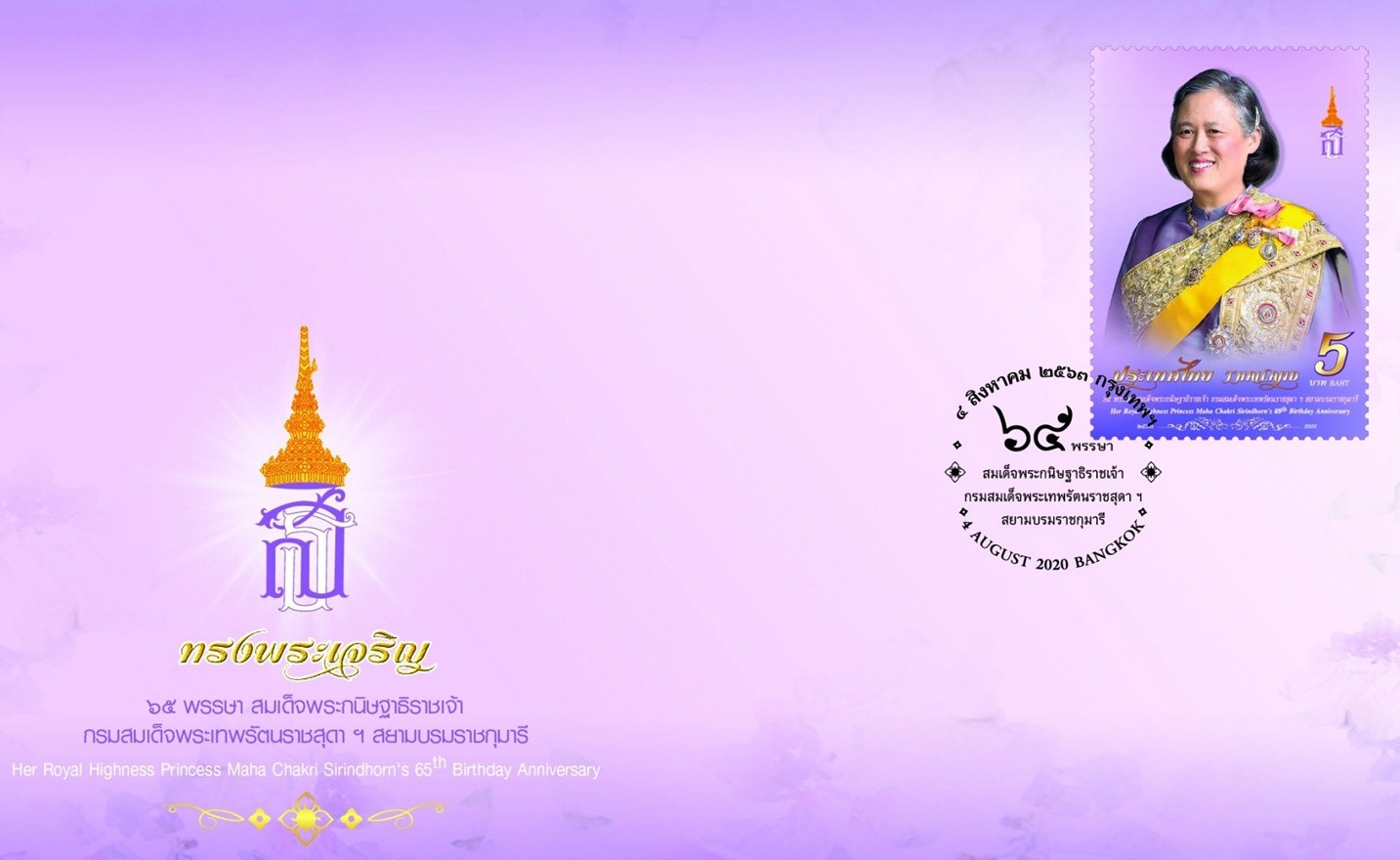 รายงานข่าวจากบริษัท ไปรษณีย์ไทย จำกัด เปิดเผยว่า บริษัทไปรษณีย์ฯ ออกตราไปรษณียากรที่ระลึกในโอกาสที่สมเด็จพระกนิษฐาธิราชเจ้า กรมสมเด็จพระเทพรัตนราชสุดาฯ สยามบรมราชกุมารี เจริญพระชนมายุ 65 พรรษา ในปี 2563 ซึ่งเป็นพระฉายาลักษณ์ในฉลองพระองค์ชุดไทยศิวาลัยสีม่วงซึ่งเป็นสีประจำพระองค์ ทรงผ้าทรงสะพักประดับเครื่อง ขัตติยราชอิสริยาภรณ์อันมีเกียรติคุณรุ่งเรืองยิ่งมหาจักรีบรมราชวงศ์ ประกอบอักษรพระนามาภิไธยย่อ “สธ” พิมพ์สี่สีพร้อมเทคนิคปั๊มฟอยล์ทองบริเวณตัวเลขบอกชนิดราคา และคำว่า ประเทศไทย THAILAND โดยจะออกจำหน่ายในวันที่ 4 สิงหาคม 2563 ราคา 5 บาท ซองวันแรกจำหน่าย 14 บาท จำนวนพิมพ์ 800,000 ดวง สำหรับผู้ที่สนใจสามารถซื้อได้ที่ทำการไปรษณีย์ทุกแห่งทั่วประเทศ พิพิธภัณฑ์ตราไปรษณียากร และทางออนไลน์ผ่านแอปพลิเคชัน หรือเว็บไซต์ thailandpostmart.com