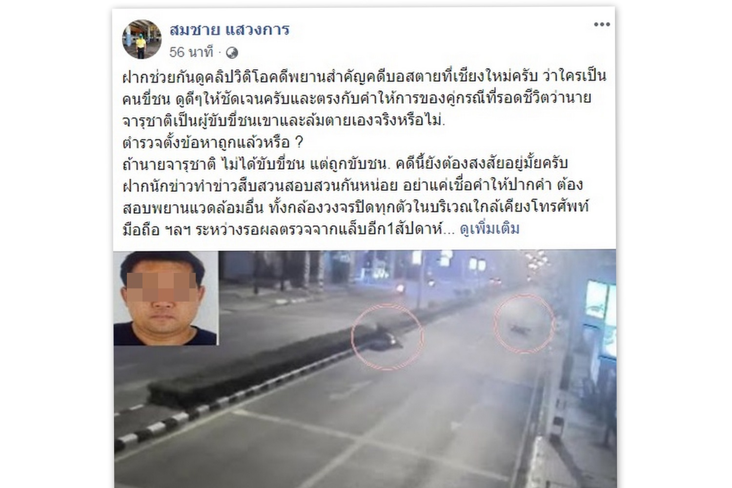 ฝากช่วยกันดูคลิปวิดิโอคดีพยานสำคัญคดีบอสตายที่เชียงใหม่ครับ ว่าใครเป็นคนขี่ชน ดูดีๆให้ชัดเจนครับและตรงกับคำให้การของคู่กรณีที่รอดชีวิตว่านายจารุชาติเป็นผู้ขับขี่ชนเขาและล้มตายเองจริงหรือไม่