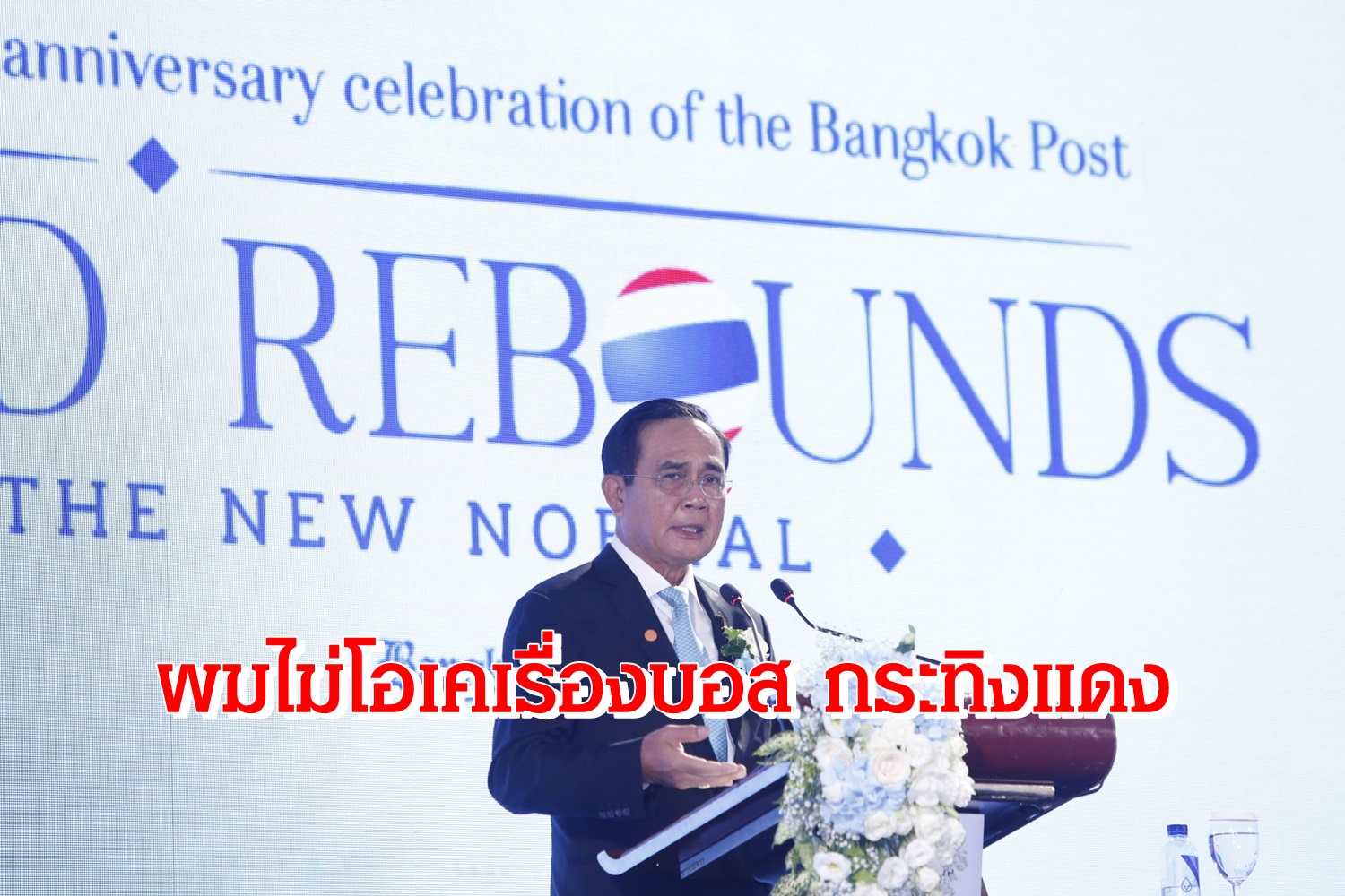 "ผมจึงขอแสดงจุดยืนของผมในเรื่องบอส กระทิงแดงว่า ผมไม่โอเค กับหลายเรื่องที่ยังไม่ชัดเจน ผมต้องการให้มีความโปร่งใส ผมจะผลักดัน และผมจะติดตามเรื่องนี้อย่างใกล้ชิด ผมพร้อมที่จะดำเนินการ หลังจากเห็นข้อสรุปของคณะกรรมการที่ผมตั้งขึ้น ซึ่งมีความเป็นอิสระ และประกอบไปด้วยผู้ที่เป็นที่ยอมรับของสังคม ทั้งในเรื่องความรู้และความเป็นกลาง ในโอกาสนี้ ผมขอเป็นกำลังใจให้กับหนังสือพิมพ์บางกอกโพสต์ในการทำหน้าที่เป็นสื่อแนวหน้าของประเทศ และสร้างสรรค์ผลงานที่จะมีบทบาทในการพลิกฟื้นและพัฒนาประเทศทั้งด้านเศรษฐกิจ สังคม การเมือง และขอให้การจัดงานในวันนี้บรรลุผลสำเร็จ ตามเจตนารมณ์ทุกประการ" พล.อ.ประยุทธ์ กล่าว