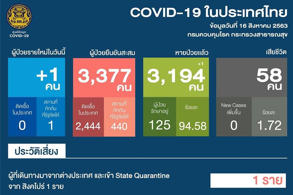 เมื่อวันที่ 16 ส.ค. 63 ศูนย์บริหารสถานการณ์โควิด-19 (ศบค.) รายงานสถานการณ์การแพร่ระบาดของไวรัสโควิด-19 ในประเทศไทยโดยมีเนื้อหาสรุปดังนี้