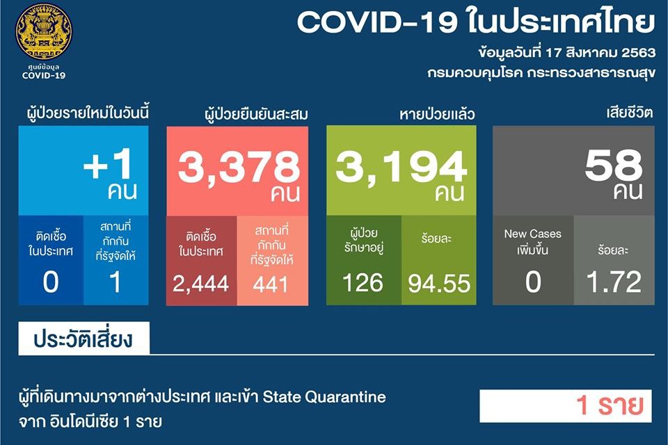 -ผู้ป่วยรายใหม่ 1 ราย เป็นนักศึกษาไทยที่เดินทางมาจากประเทศอินโดนีเซีย อายุ 24 ปี เดินทางถึงไทยวันที่ 3 ส.ค. เข้าพักState Quarantine จ.ชลบุรี 15 ส.ค. ผลตรวจพบเชื้อแต่ไม่แสดงอาการ