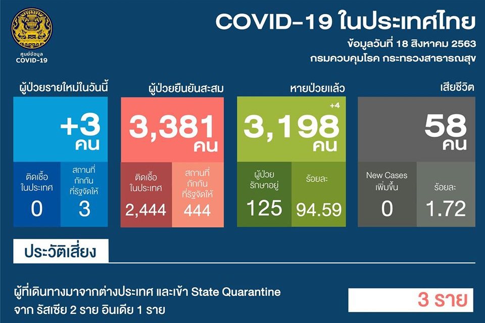 เมื่อวันที่ 18 ส.ค. 63 ศูนย์บริหารสถานการณ์โควิด-19 (ศบค.) รายงาน สถานการณ์การแพร่ระบาดของไวรัสโควิด-19 ในประเทศประจำวัน โดยมีเนื้อหาดังนี้